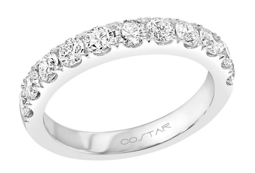 Celebrate your forever with this stunning 14K white gold diamond wedding band. Featuring 11 brilliant round diamonds totaling 1.00 carat, each stone is expertly set in a sleek, straight prong design that maximizes sparkle and allure. The luminous white gold band offers timeless elegance, making this ring the perfect symbol of your enduring love. Ideal for stacking or wearing solo, this women's diamond wedding band is a classic, sophisticated choice to cherish for a lifetime.