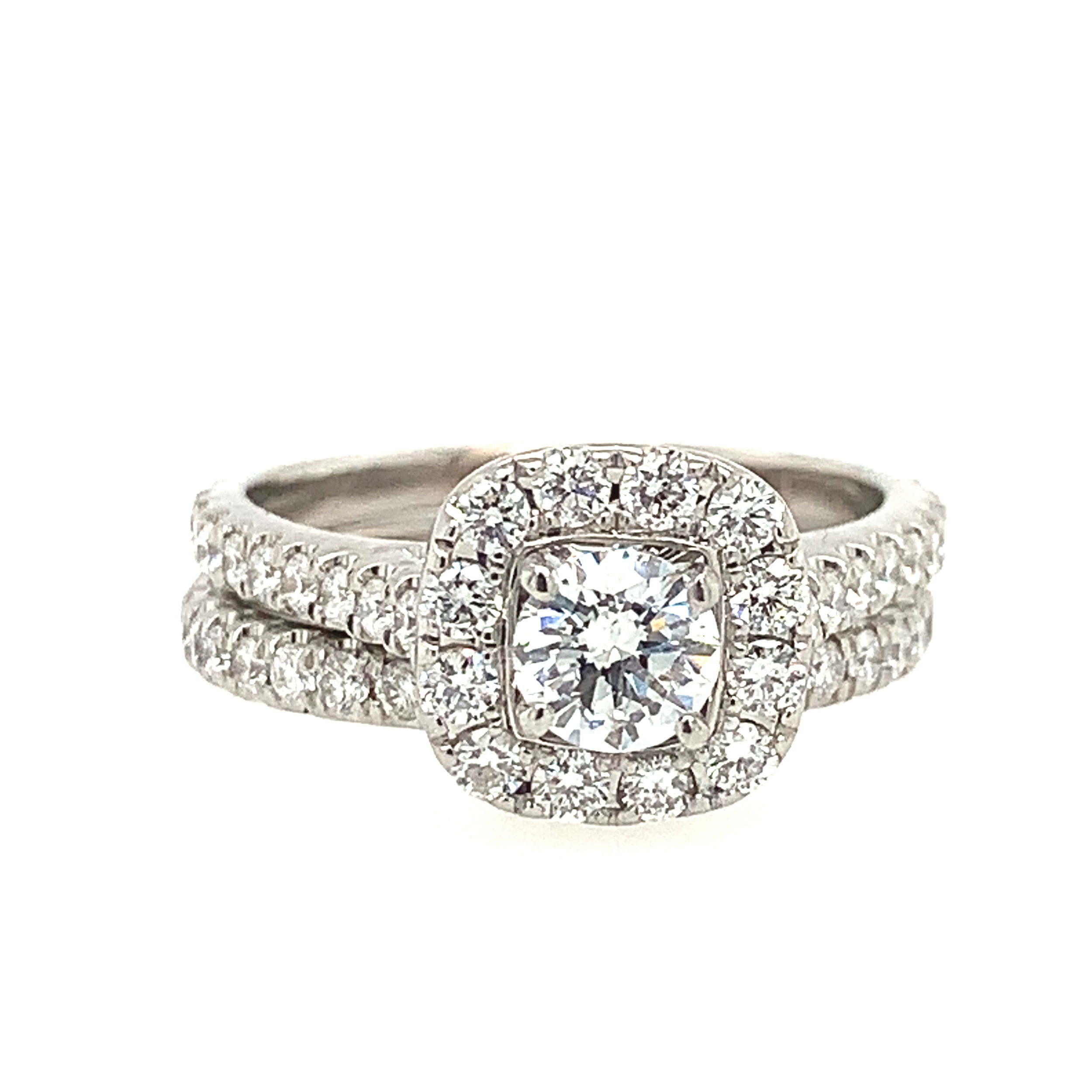 - 14K WG 0.44CT G/SI2 & 52 BR DIA'S 0.75CT HALO ENGAGEMENT RING W/ MATCHING WEDDING BAND CONTAINING 23 BR DIA'S 0.35CT