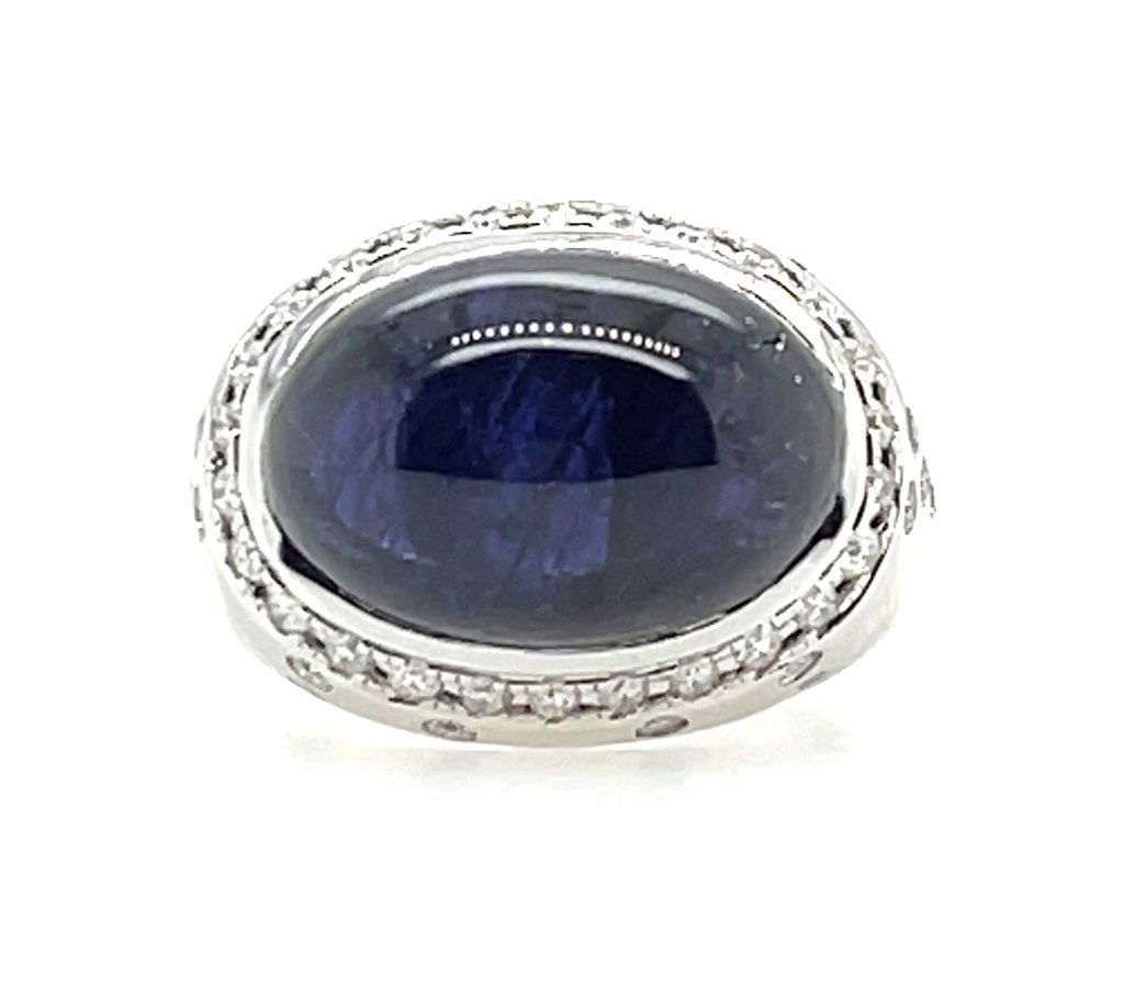 18KWG 19.55CT OVAL CABOCHON SAPPHIRE & 45 BR DIA 0.62CT RING