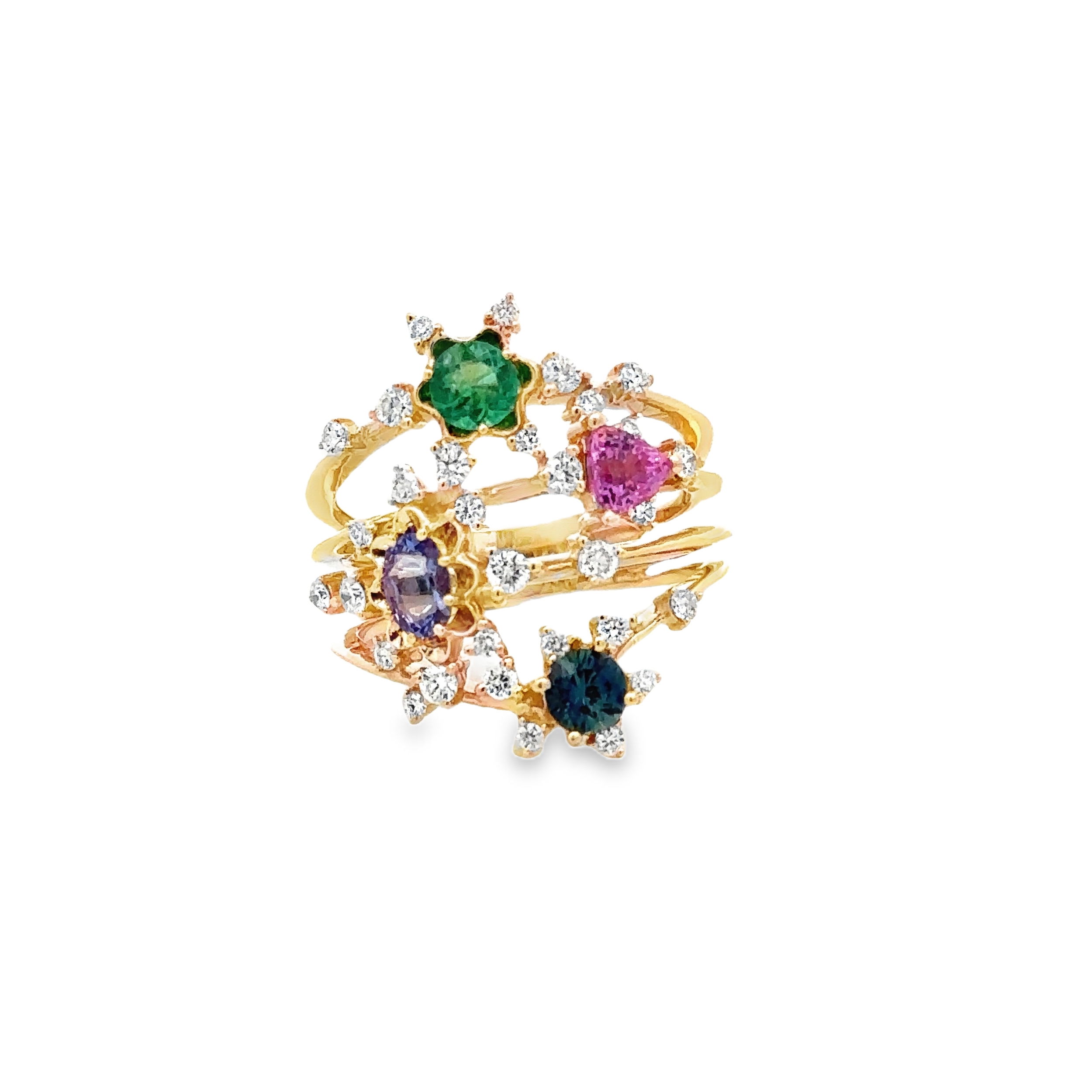 14KYG EMERALD, TANZANITE, BLUE & PINK SAPPHIRE 1.30CT & 31 BR DIAMONDS 0.45CT FASHION RING