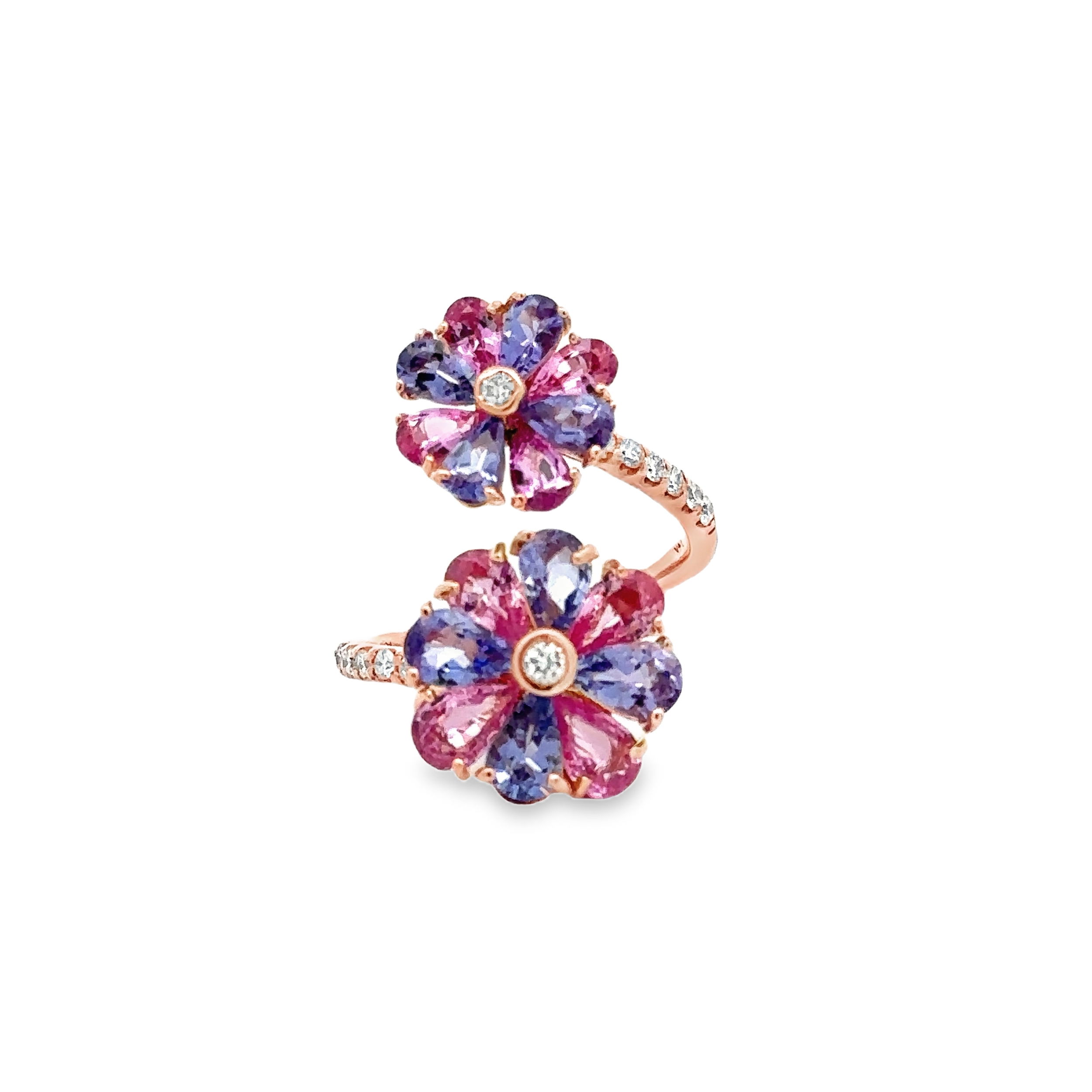 14KRG 8 PEAR TANZANITE & 8 PEAR PINK SAPPHIRES 5.00CT -- 14 BR DIAMONDS 0.30CT BYPASS FLOWER RING