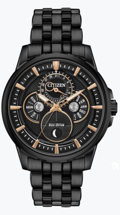 - CITIZEN MENS "CALENDRIER" BLACK ION PLATED SS BRACELET, ECO DRIVE MOON PHASE WATCH