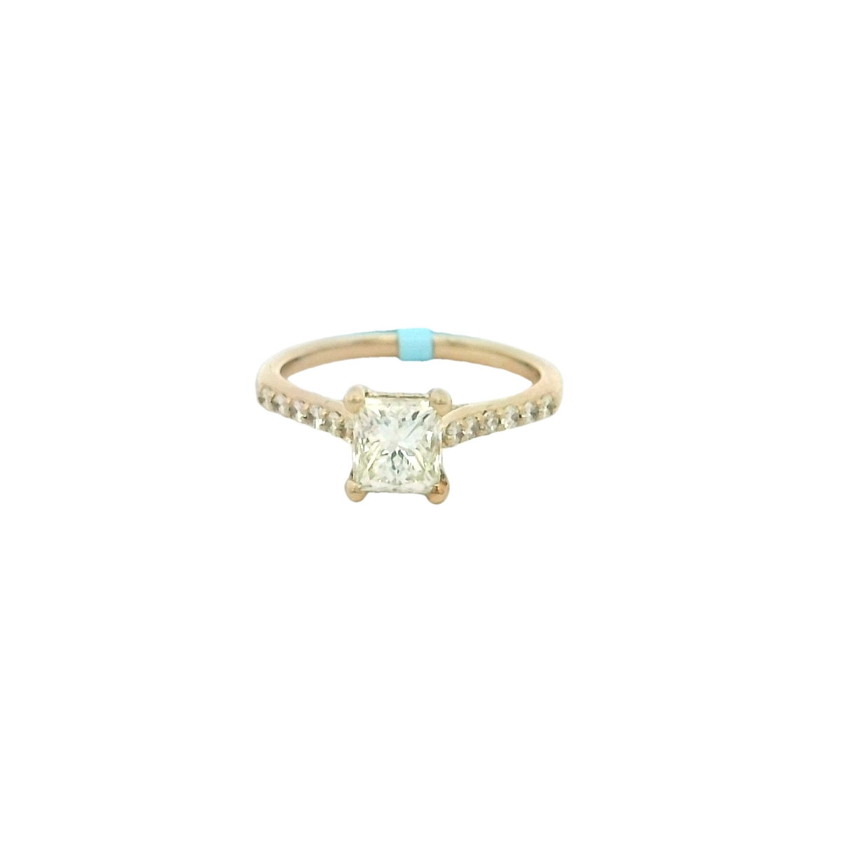 Radiating modern elegance, this breathtaking engagement ring features a dazzling 1.08 carat princess-cut diamond at its center, expertly crafted from 14K yellow gold. The center diamond boasts a captivating K color and VVS2 clarity, enhanced by HPHT treatment for exceptional brilliance. Twenty-four round brilliant accent diamonds, totaling 0.23 carats, are meticulously set along the cathedral-style band, adding to its shimmering allure. This timeless ring is a perfect symbol of your unique love story, merging classic sophistication with contemporary flair.
