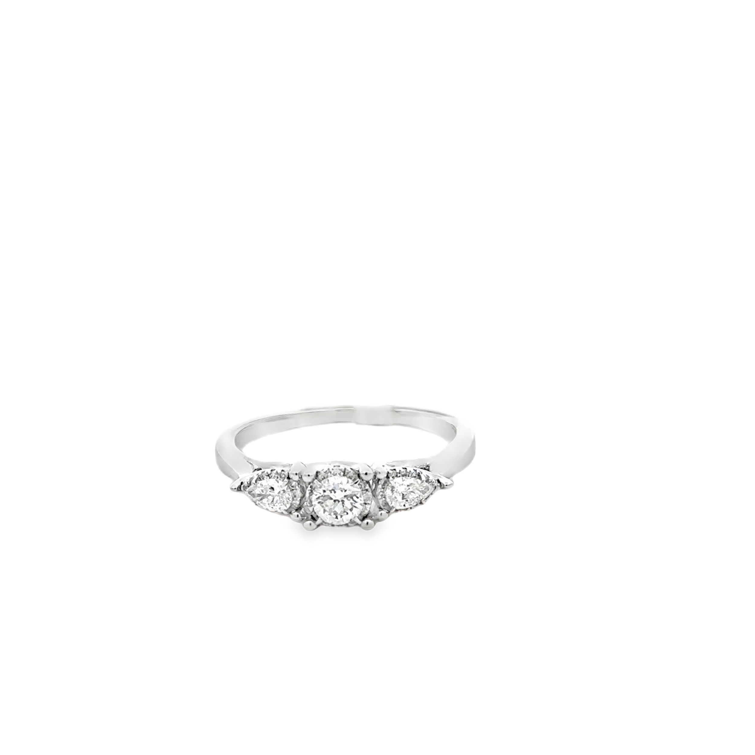 14KW 0.20CT ROUND -- 2 PEAR SHAPE & 36 ROUND DIAMONDS 0.30CTW 3-STONE RING