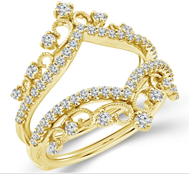 Enhance your cherished ring with timeless elegance using our Women’s Diamond Ring Guards crafted in lustrous 10K yellow gold. This sophisticated piece is designed to gracefully encircle and protect your center ring, accentuating it with a radiant row of genuine diamonds. Each sparkling stone is meticulously set to provide an added touch of luxury and brilliance, making your ensemble truly unforgettable. Perfect for stacking or wearing alone, this diamond ring guard beautifully combines security and style, ensuring your most precious jewelry stands out for every occasion.
