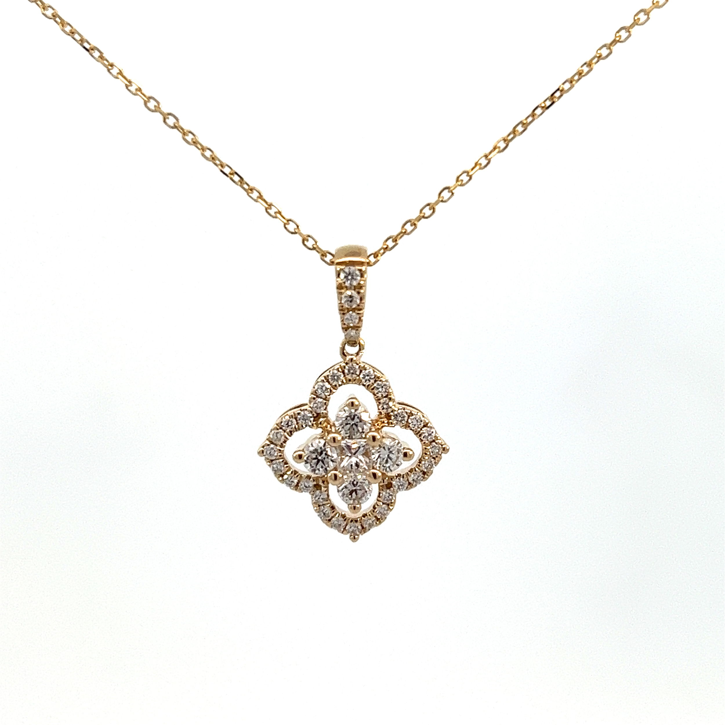 14KYG 1 PRINCESS CUT DIAMOND & 36 ROUND DIAMONDS 0.50CTW CLOVER SHAPED PENDANT W/18" CABLE CHAIN