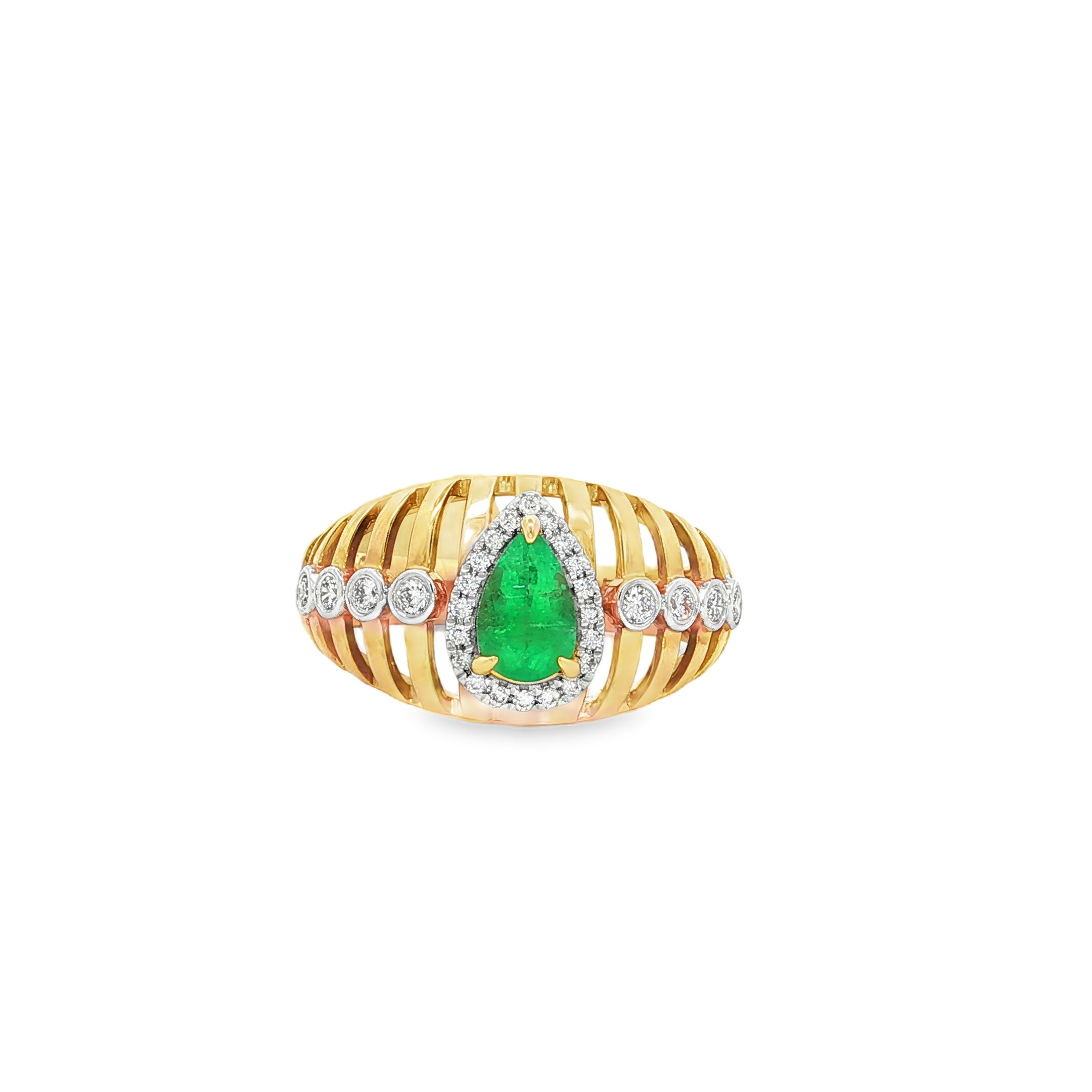 18KY 0.54CT PEAR SHAPE EMERALD & 28 ROUND DIAMONDS 0.22CT CONTEMPORARY HALO RING