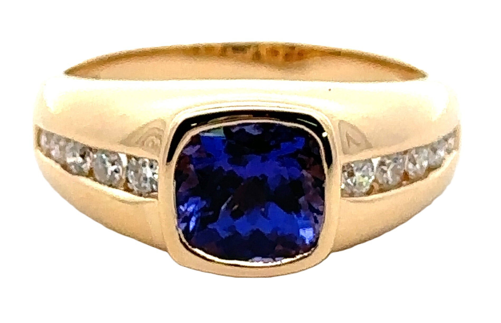 18KY 2.69CT CUSHION TANZANITE & 10 ROUND DIAMONDS 0.39CT CHANNEL SET MEN'S RING