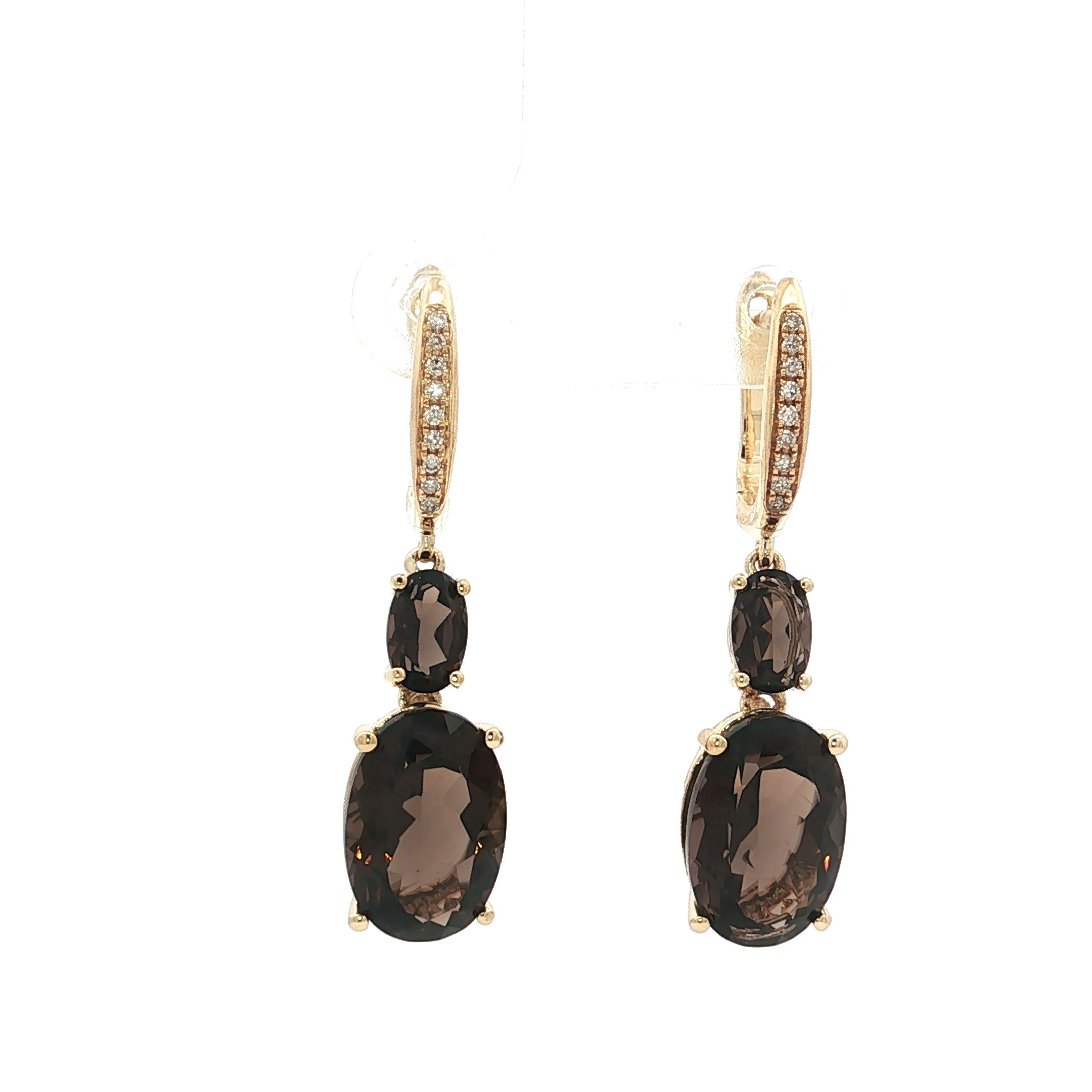 14KYG 4 OVAL SMOKY QUARTZ @ 7.58CT & 18 DIAMONDS @ 0.072CT DANGLE EARRINGS