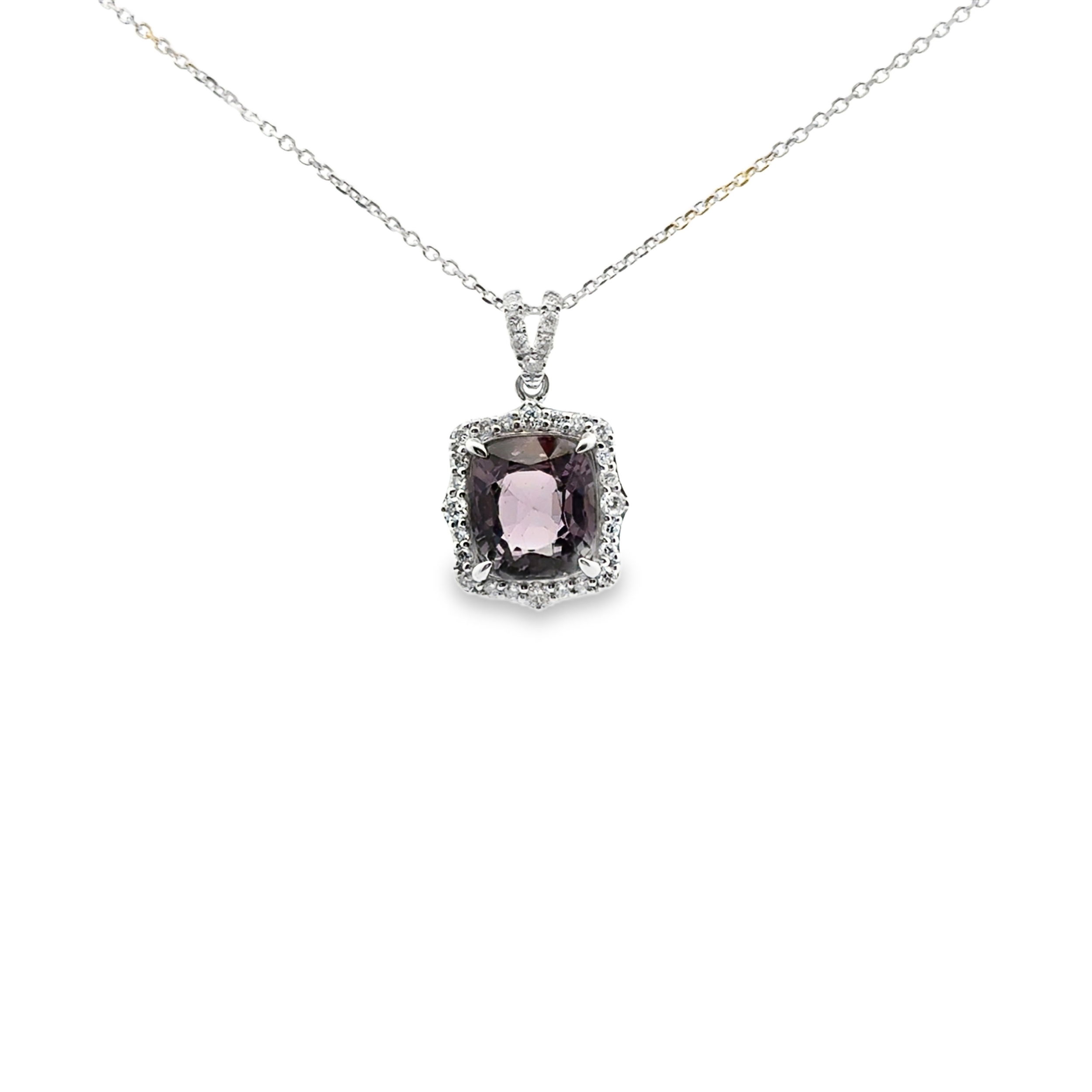 18KW 2.37CT CUSHION PURPLE SPINEL & 31 ROUND DIAMONDS 0.21CT HALO PENDANT W/18" CABLE CHAIN