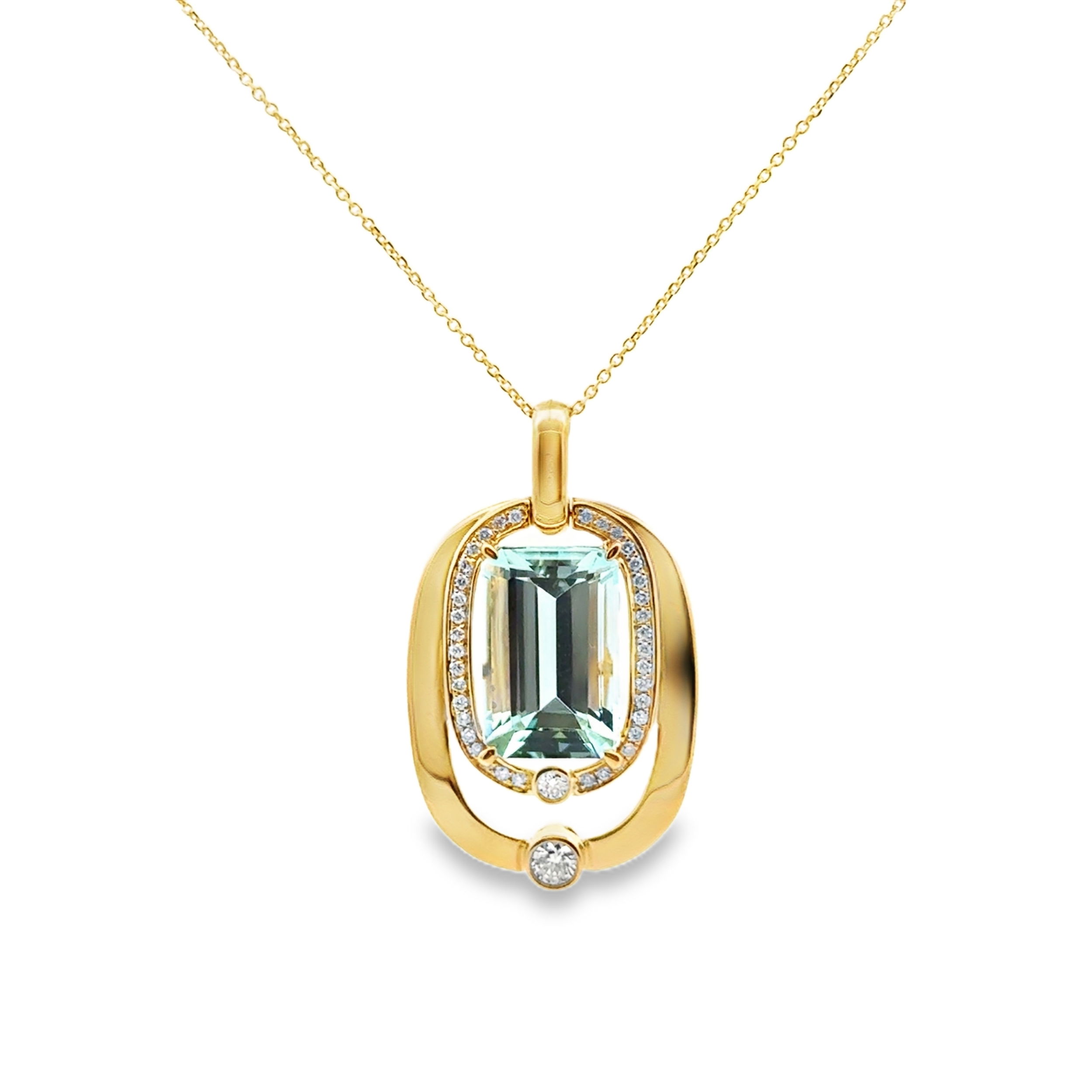 - 18KYG 5.90CT EMERALD CUT AQUAMARINE & 40 ROUND DIAMONDS 0.31CT POLISHED FREE-FORM PENDANT W/18" CABLE CHAIN