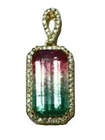 - 18KY 6.50CT EMERALD CUT WATERMELON TOURMALINE & 57 ROUND DIAMONDS 0.24CT HALO PENDANT W/18" CABLE CHAIN