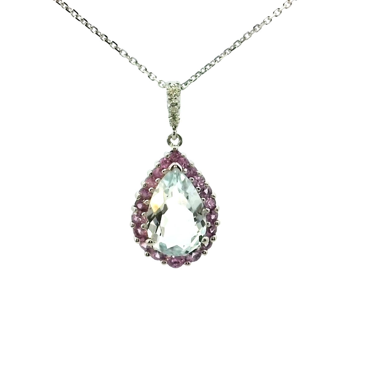 14KWG 1 PS AQUA & 20 RD PK SAPH'S 3.90CTW & 3 DIA'S 0.07CTW FAHSION PENDANT W/ 16" WG CHAIN
