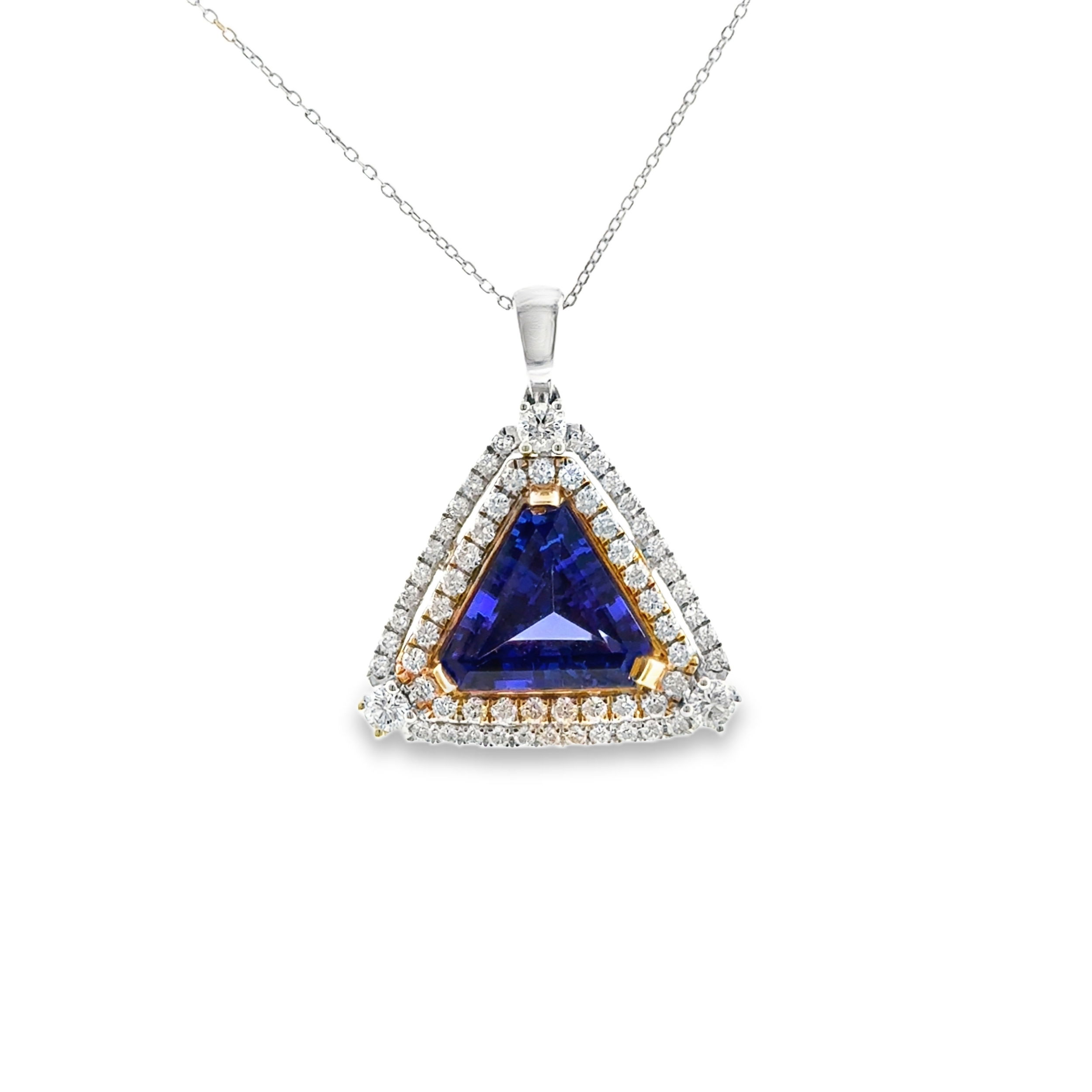 Elevate your elegance with this mesmerizing 14K white and yellow gold pendant, featuring a stunning 6.33-carat triangular tanzanite at its center. The captivating violet-blue gemstone is expertly haloed by 63 brilliant round diamonds (totaling 1.375 carats), enhancing its brilliance and allure. Suspended from an 18-inch cable chain for timeless sophistication, this gemstone pendant is a true testament to exquisite craftsmanship—perfect for those seeking a unique and luxurious statement piece.