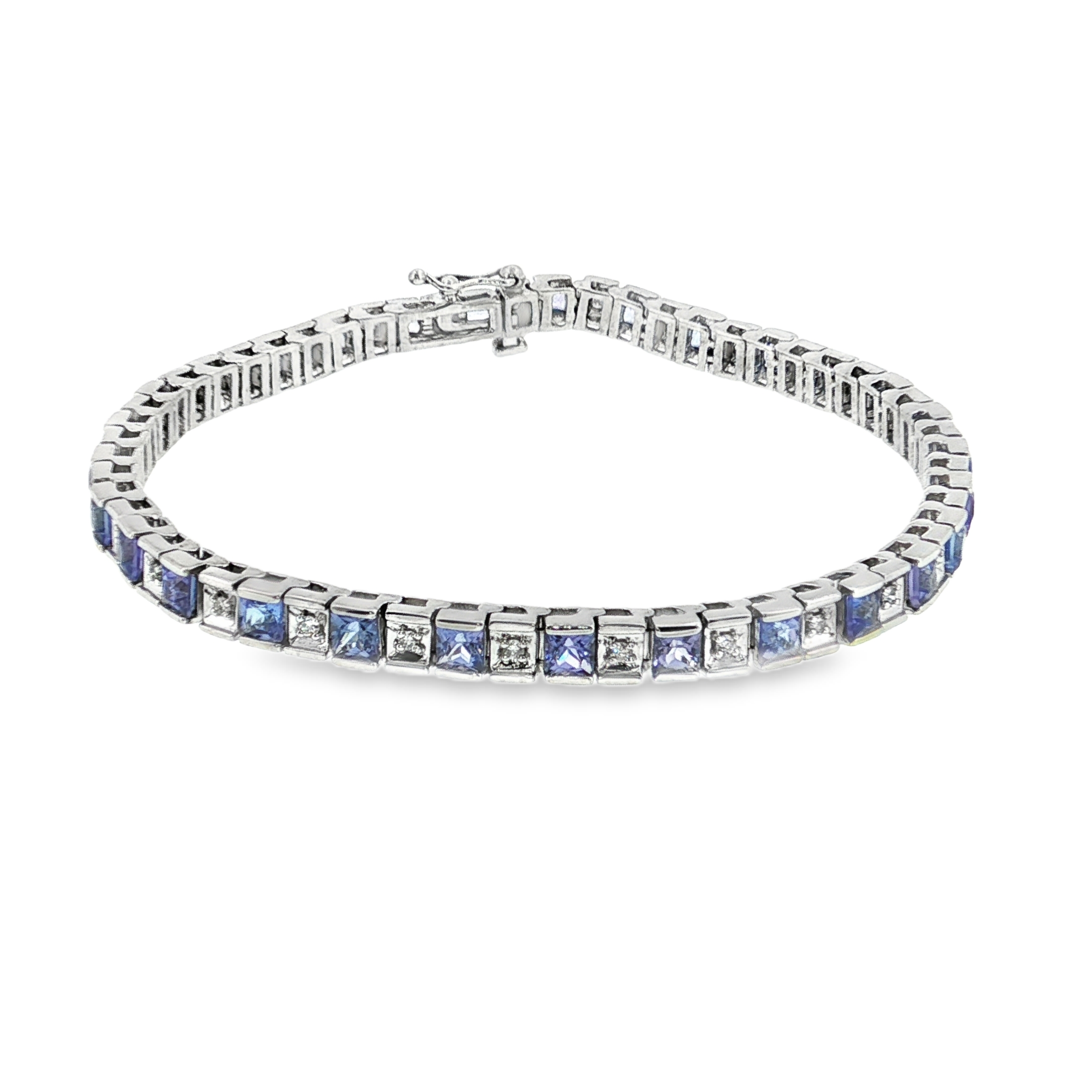 Elevate your elegance with this stunning gemstone bracelet, expertly crafted in luminous 14K white gold. Showcasing a series of princess-cut tanzanite gemstones, each stone radiates a mesmerizing violet-blue hue, offering a graceful pop of color to your wrist. The contemporary yet timeless design ensures this bracelet is perfect for both everyday luxury and special occasions. Secure, sophisticated, and striking—it's a must-have addition to any fine jewelry collection.