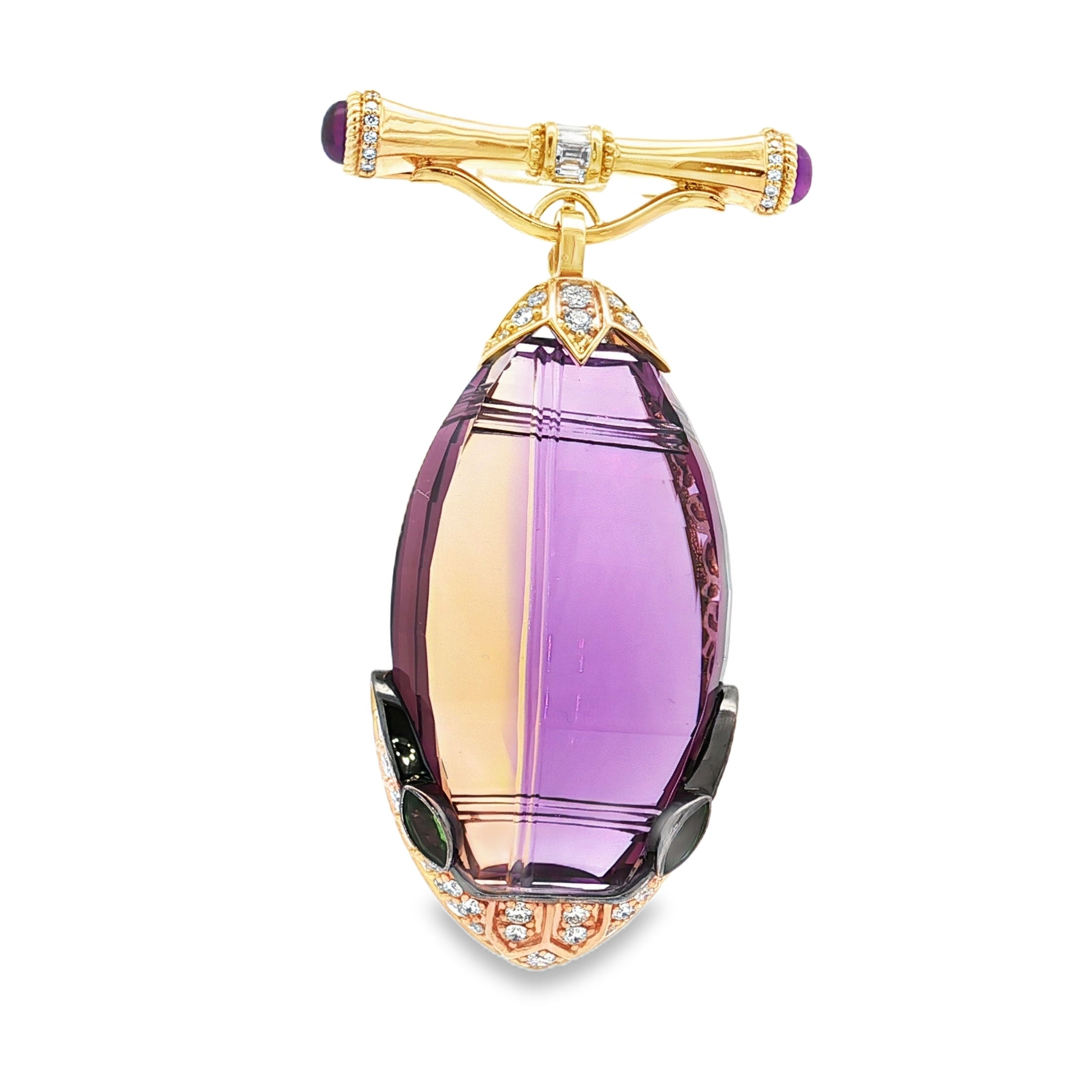 18KY 81.58 AMETRINE, 1.20CTTW AM, .50CTTW TSAV & 1.70CTTW RB DIA BROOCH