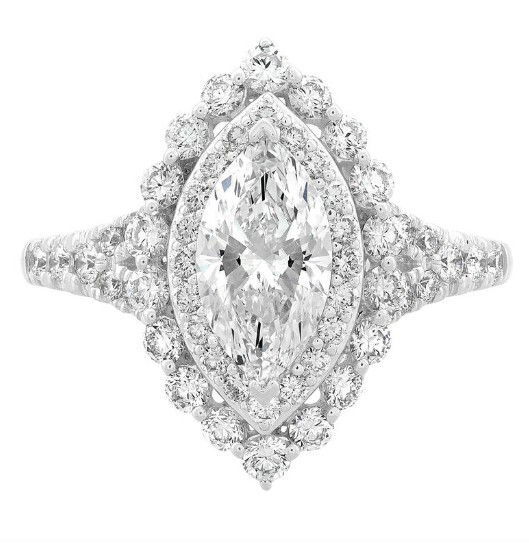 - 14KWG 1.02CT E/VVS2 MQ LG DIA & 56 RD LG DIA'S 0.98CTW DOUBLE HALO ENGAGEMENT RING