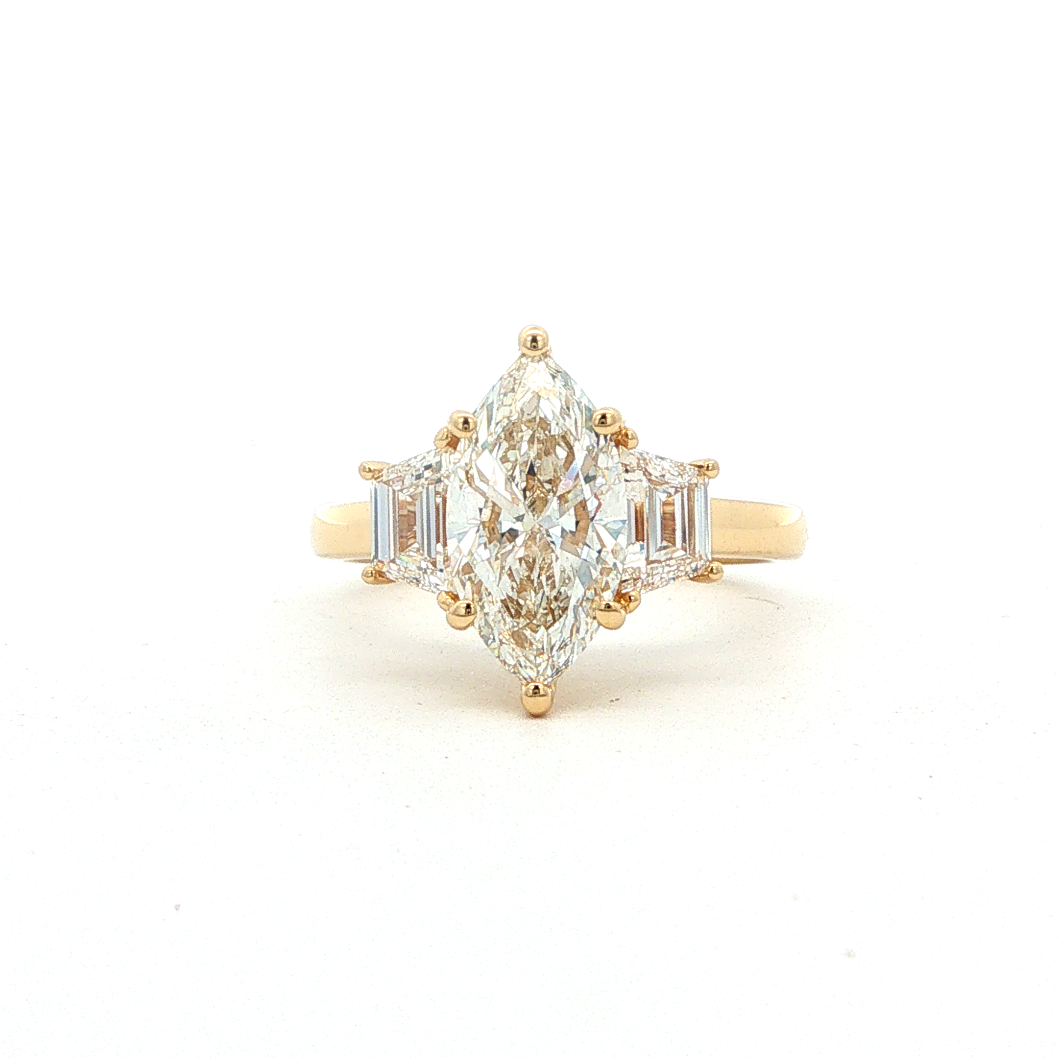 14KYG 2.09CT G/VS1 MARQUISE LG DIA & 2 TRAPEZOID LG DIA'S 0.71CTW 3-STONE ENGAGEMENT/ANNIVERSARY RING